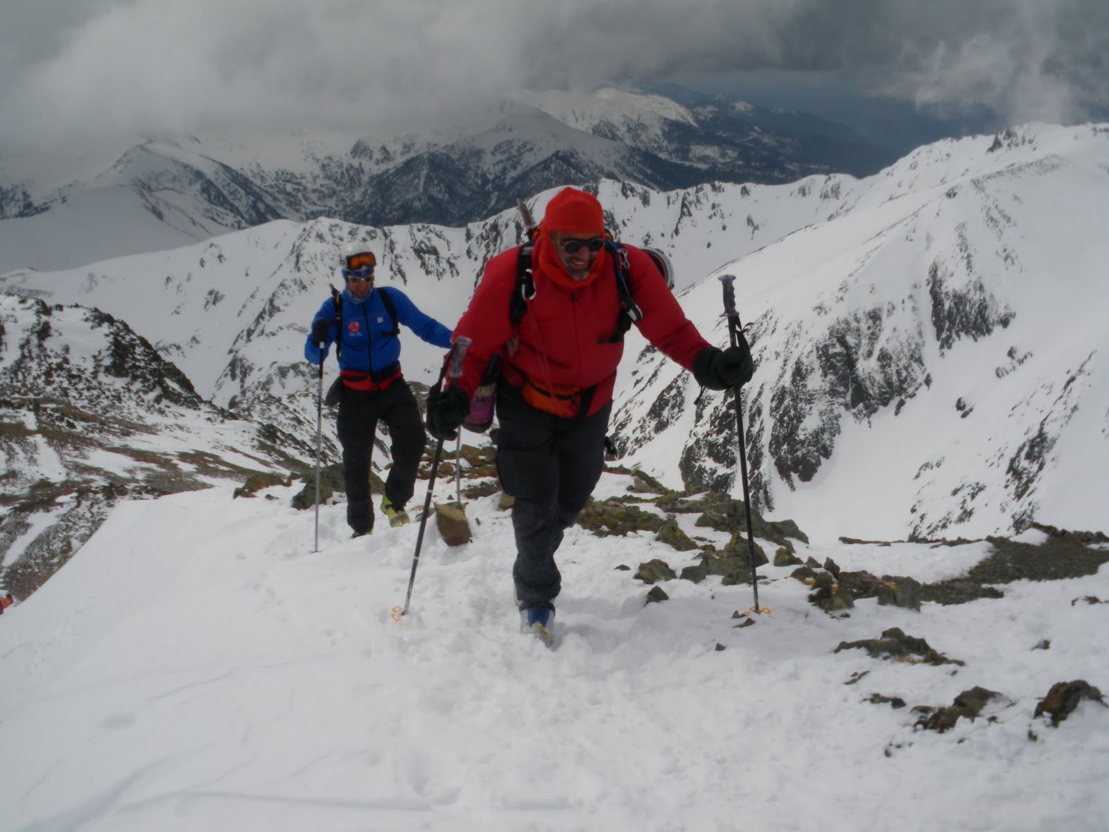 Con una previsión no muy esperanzadora partimos desde Arinsal con los esquis en la espalda (no todos jeje) a buscar la nieve por el camino que va hacia el Pla del Estany, pero nos desviamos a la izquierda para entrar en el valle de comapedrosa. Disfrutamos de un breve almuerzo en el refugio de Comapedrosa y continuamos hacia nuestro objetivo por los llanos de este valle hasta que giramos al norte y empezamos a ganar pendiente. Pasamos el Estany Negre y mientras unos vamos yendo poco a poco por la empinada pala final de Comapedrosa, otros se apuntan una ascensión expres a la Agulla de Baiau, para darnos alcance después. El descenso por donde hemos subido hasta los llanos, para volver a poner focas y ganar la Portella de San Fons, y en media ladera el Port Vell, que nos esperaba con una gran cornisa. Descenso kilomñetrico por las pistas de esquiar de Arinsal.